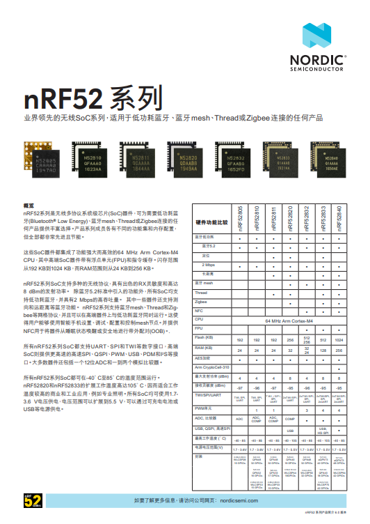 nRF52 系列 业界领先的无线SoC系列,适用于低功耗蓝牙、蓝牙mesh、Thread或Zigbee连接的任何产品